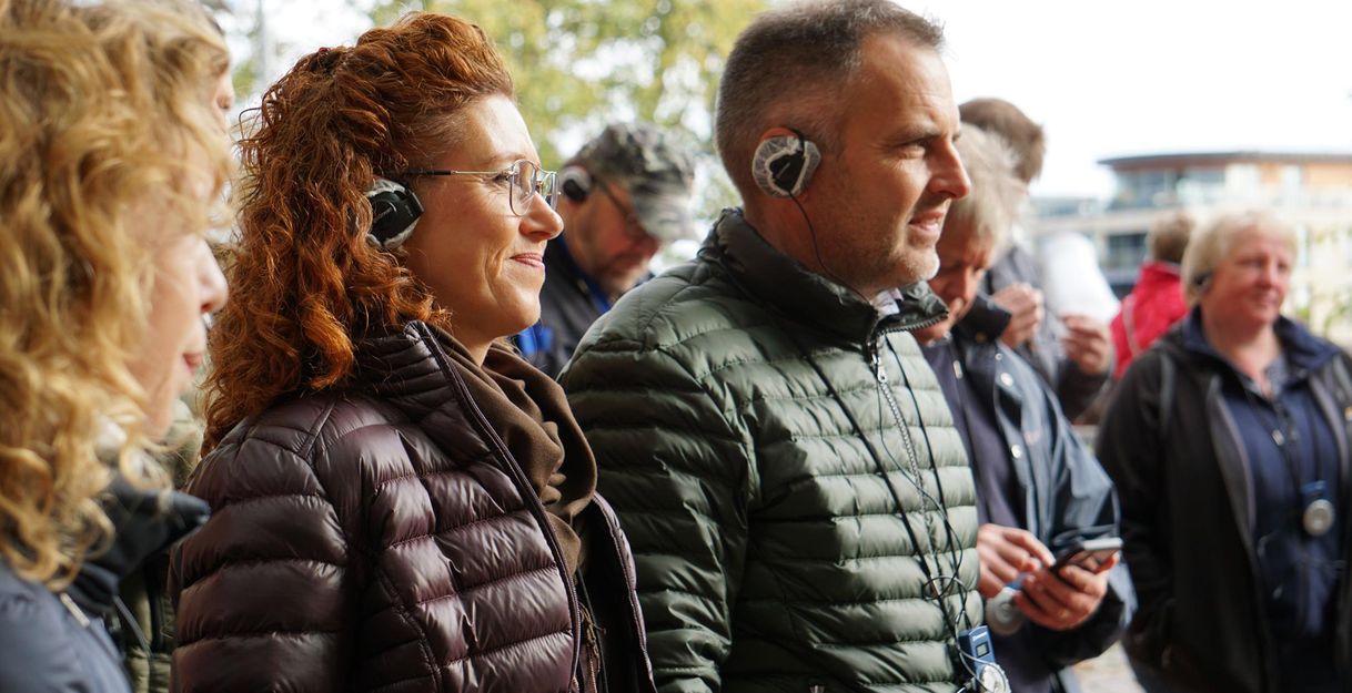 Zum Einsatz kommt dabei eine Funkübertragungsanlage, die für diese Stadtführungen von dem Verein "Hören ohne Barriere - HoB e.V." bereitgestellt wird. Die Worte der Stadtführerin oder des Stadtführers werden mittels einer Halsringschleife unmittelbar auf das Hörgerät übertragen. Menschen ohne Hörtechnik können Kopfhörer nutzen.