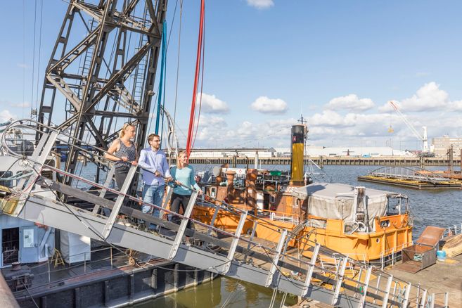 Über die Pontonanlage sind der Schutendampfsauger SAUGER IV von 1909 und der Schwimm-Dampfkran SAATSEE von 1917 zugänglich. Beide Großobjekte verfügen über Dampfanlagen, die an einem Wochenende im Monat in Betrieb genommen werden. Die Arbeit des Ewerführers und das Leben an Bord zeigt eine Ausstellung auf der Hamburger Kastenschute H 11347 von 1913.