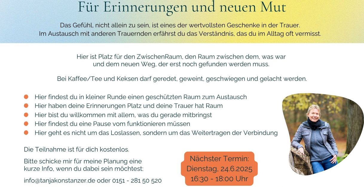 In kleiner Runde biete ich dir und anderen Trauernden einen geschützten Raum zum Austausch. In gemütlicher Atmosphäre bei Kaffee, Tee und Keksen darf geredet, geweint, geschwiegen und gelacht werden.