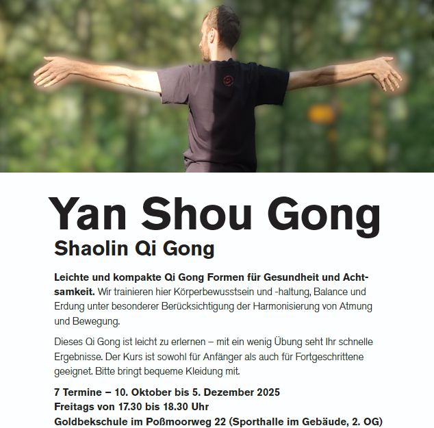 Yan Shou Gong is a traditional Qi Gong practice originating from authentic Shaolin NeiGong. It strengthens body and mind, promotes mindfulness, and brings energy into your daily life.